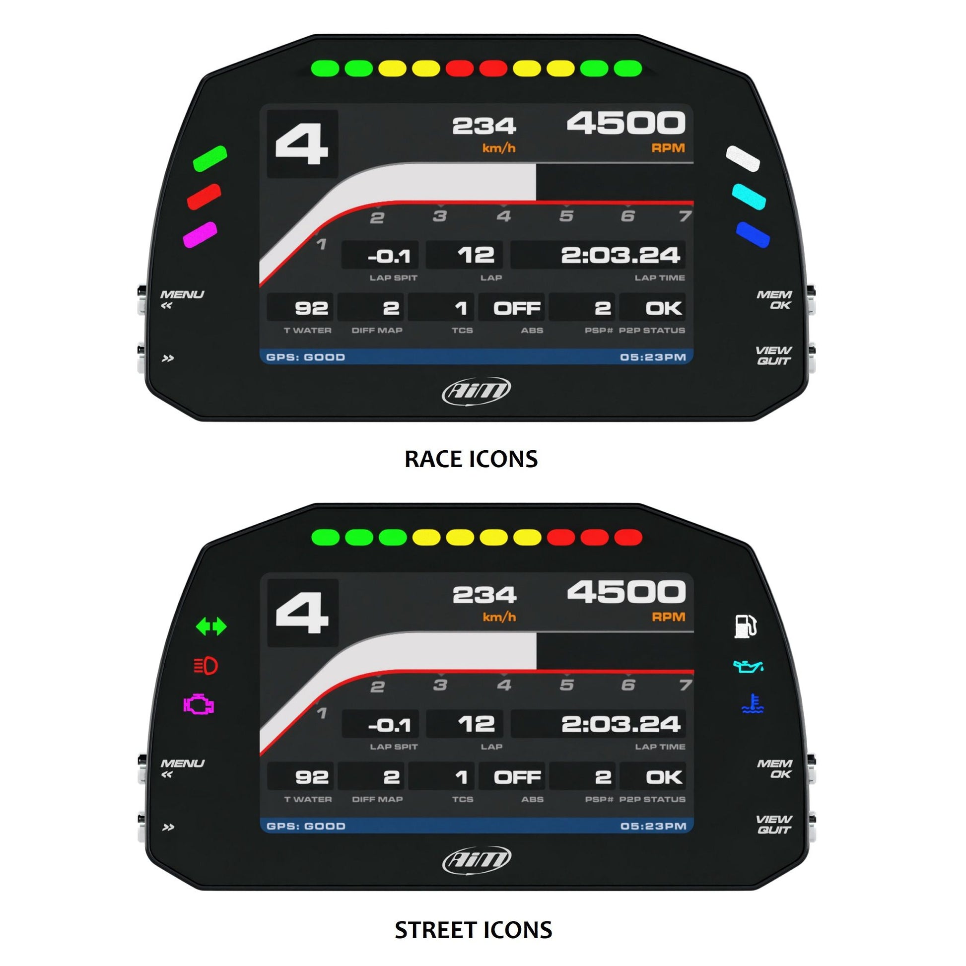 This dash display is suitable as a replacement unit for those supplied with the AIM Motorsport PDM kits or as an upgrade for PDM kits which do not include a dash display. There are 2 display type options, one with race icons and one with IVA complaint street icons.